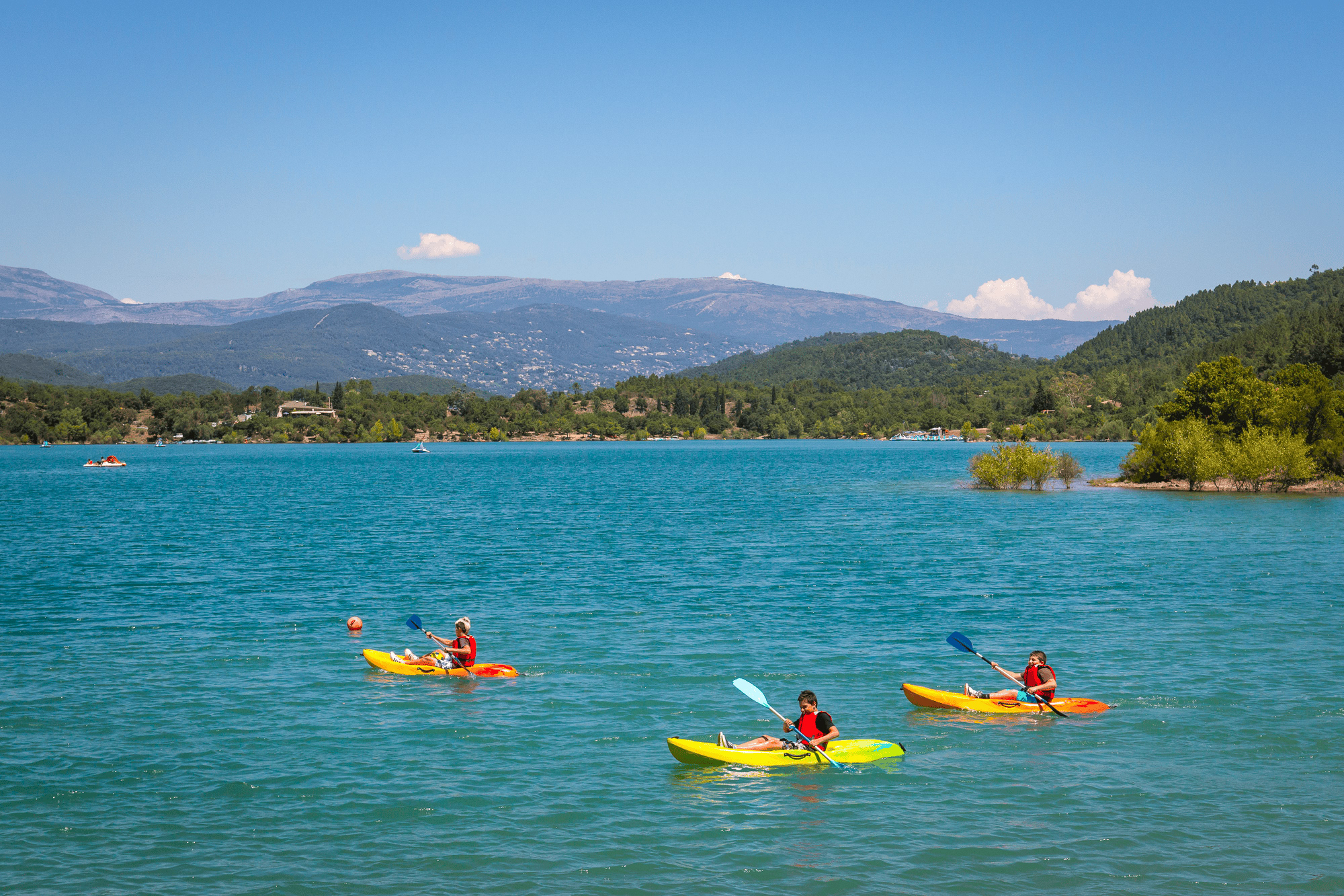 1. Pédalo : Les bases telles que Saint-Cassien Aventures proposent des pédalos (1 à 4 pers.), certains équipés de toboggans pour un moment ludique en famille. Un moyen calme et accessible de profiter du lac, sans effort.