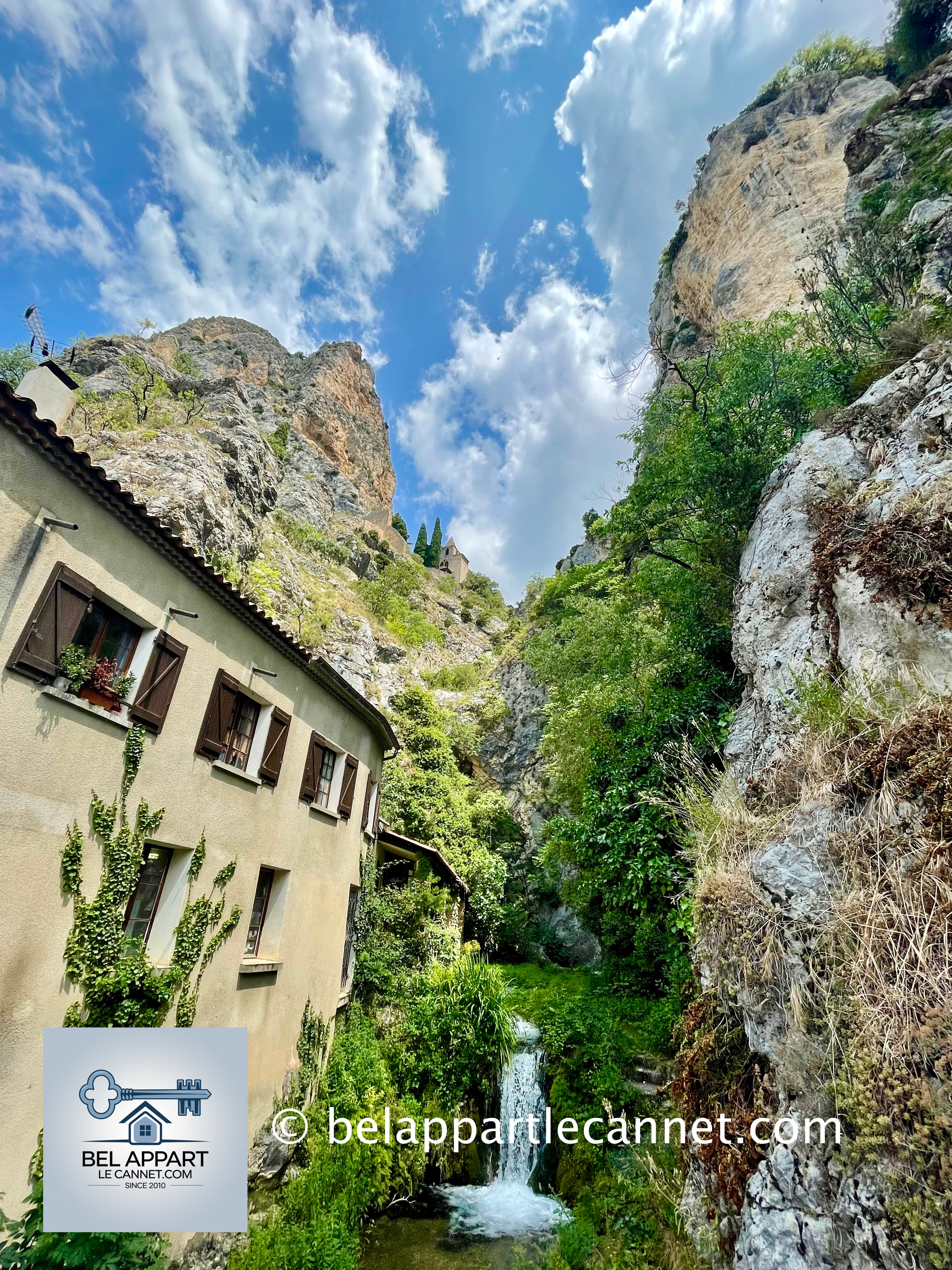 La Cascade possède une grande terrasse panoramique face à la cascade naturelle du ruisseau traversant Moustiers, offrant une atmosphère fraîche et relaxante pendant le repas.