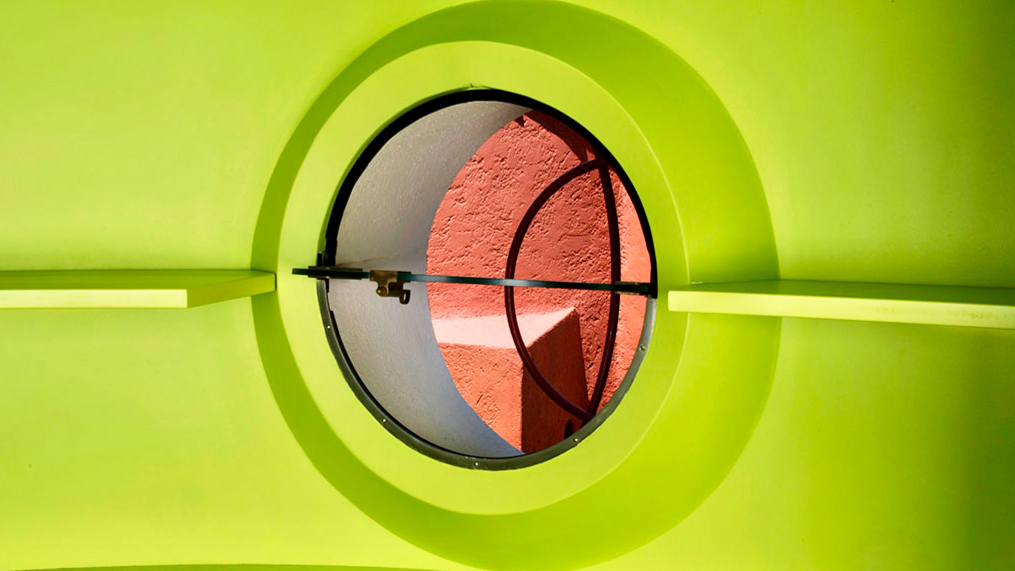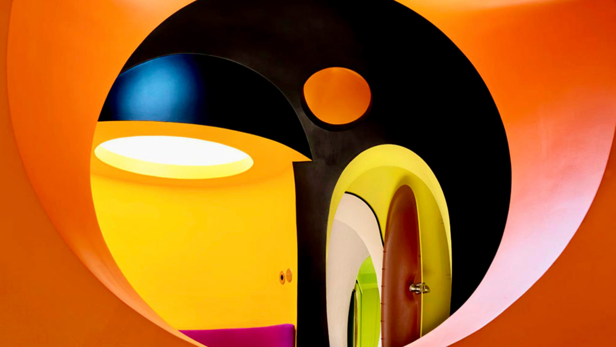 À l'intérieur, les espaces sont surprenants : pièces en enfilade, ouvertures circulaires, jeux de lumière, couleurs vives…