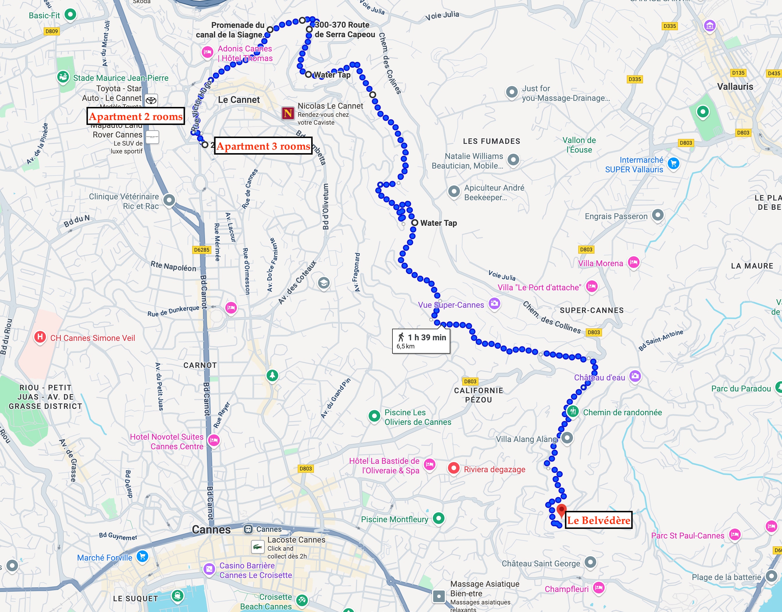 The Siagne Canal walk, stretching from the hills of Le Cannet to Cannes, is a 1.5 to 2-hour route covering between 3 and 6 km, depending on the chosen path, and is accessible all year round.